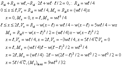 図の梁の場合に、せん断力、曲げモーメント、最大曲げモーメントの値、せん断力図、曲げモーメント図を求める。