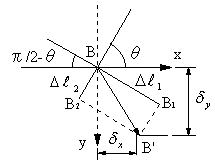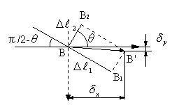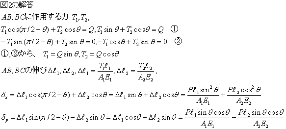 とする。∠ABC=π/2,∠BCA=θとするときに、図1では荷重Pが垂直下方に、図2では水平方向に荷重Qが作用するときに、B点のx方向の変位とy方向の変位を求める。