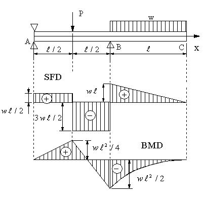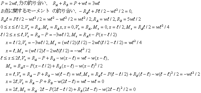 図の梁の場合に、各支点の反力、せん断力、曲げモーメント、せん断力図、曲げモーメント図を求める。