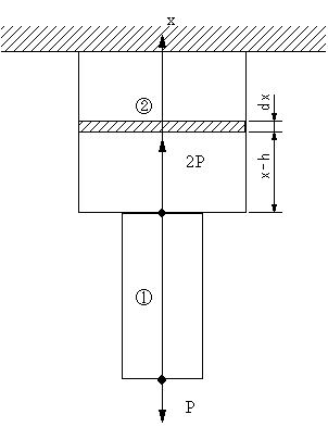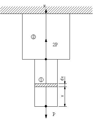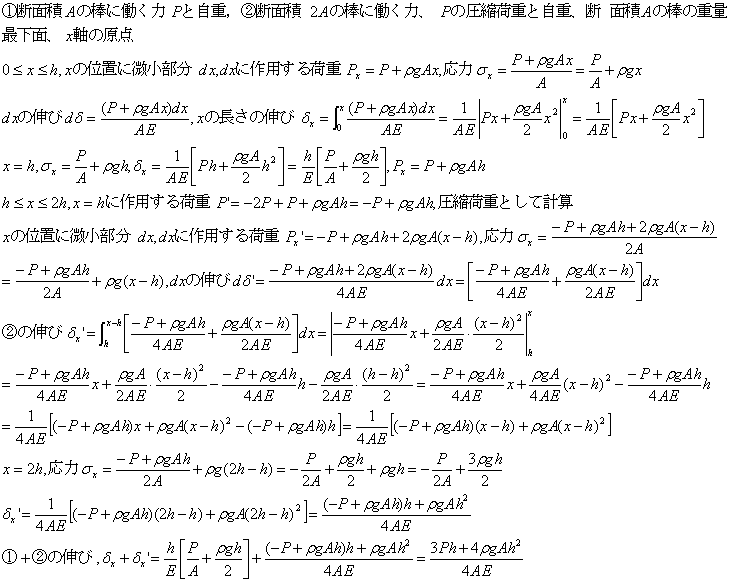 上部が固定されている@,Aの棒にP,2Pの荷重が作用している。自重を考慮し、生ずる応力と伸びをxの関数として求める。また、全体の伸びを求める。ただし、密度ρ、ヤング率E、面積Aとする。