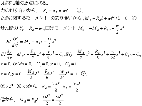 図の梁の場合に、Aにおける反力、反モーメント、Bにおける反力を求める。ヤング率E,断面二次モーメントIとする。