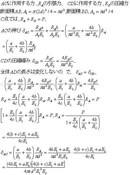 図のように直径2dとdの軸がA,D点で剛体壁に固定されている。C点に荷重Pが作用するとき、A点とD点の反力とC点の変位量を求める。AB,BD材のヤング率E