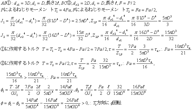 この部材の許容せん断応力をτaとする。F=P/2とするとき、Pによる許容ねじりモーメント値Paを求める。このとき、F=P/2として、軸の先端に生じるねじれ角度の大きさφを求める。
