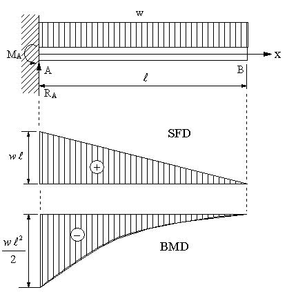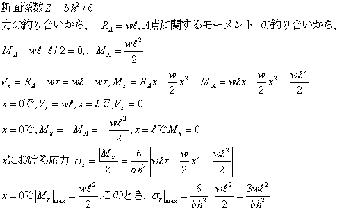 矩形断面の幅b、高さhの片持ち梁に単位長さ当たりwの等分布荷重が作用するとき、固定点の反力、モーメントを求め、せん断力、曲げモーメント、せん断力図、曲げモーメント図、Aからxの位置の断面に生ずる引張応力とその最大値を求める。