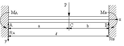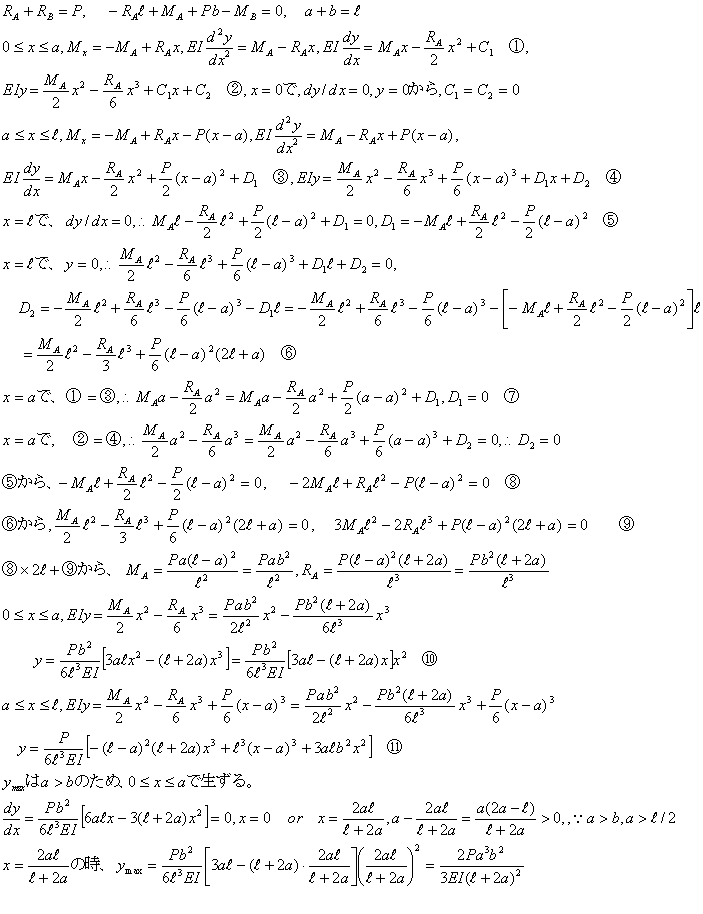図の両端固定梁の場合に、たわみの式とたわみが最大となる位置と最大たわみを求める。但し、a>b、弾性係数E、断面二次モーメントIとする。