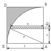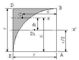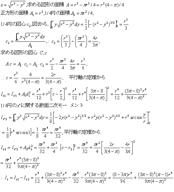図においてABDEは一辺rの正方形。ABEはAを中心とする半径rの円の1/4である。円の一部はB,E点において正方形に接している。斜線の部分の図心と断面二次モーメントを求める。
