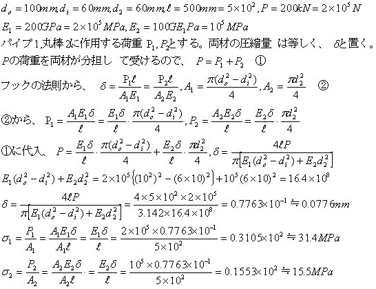 =100GPaとして、それぞれの材料に発生する応力と部材全体の圧縮量を求める。