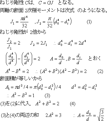 の中空軸の断面積が等しい。両者は同じ材料で剛性率Gとする。両軸にねじりモーメントTが作用するとき、中空軸のねじり剛性を中実軸の2倍にしたいとき、d