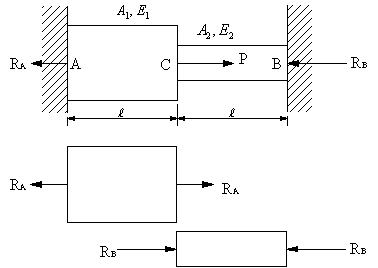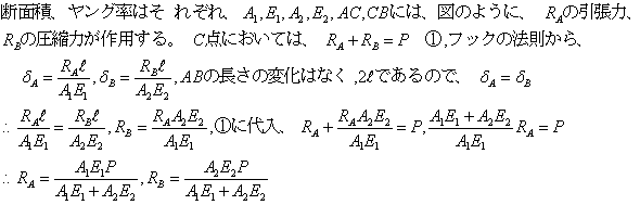 の棒が剛体壁に固定されている。固定点A、Bに生ずる反力R