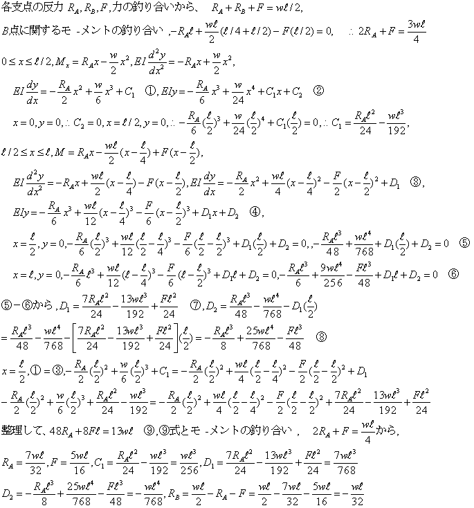 *求める値によっては、重ね合わせ法、カスチリアノの定理など用いる方法があります。上記の解法は一般的な梁の解法を用いました。この問題では、L/2の寸法があり、たわみの式にはx^4の高がありますので、計算はかなり複雑になります、