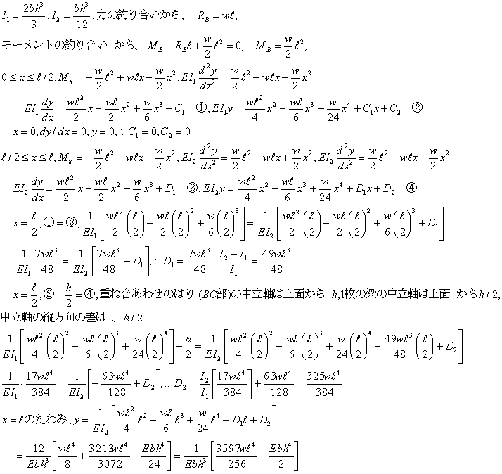 片側が固定されたヤング率E,幅b, 厚さh, 長さLの長方断面をもつはりと、長さのみ半分のはりの2枚を図のように重ね合わせ(BC部)、接着し、長いはりに等分布荷重w(単位長さ当たり)が作用する時、点Aのたわみ量を求める。