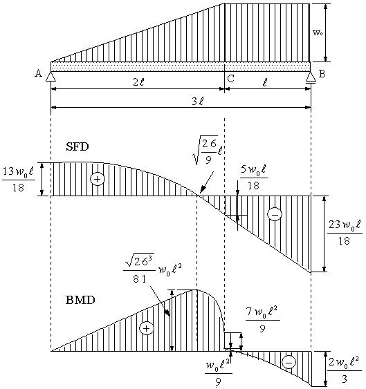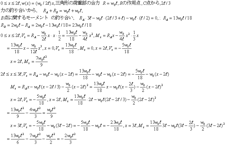 | 図のように両端支持はりに、AC間に三角形の分布荷重、CB間に単位長さ当たりwoの等分布荷重が作用する場合に、A,B点の反力と、せん断力、曲げモーメント、せん断力図、曲げモーメント図を求める。 |