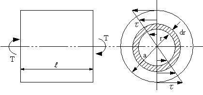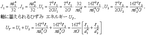 図に示す段付き丸棒軸にトルクTが作用する。この時、軸に蓄えられるひずみエネルギーを計算する。棒の断面は円形とし、横弾性係数はGとする。
