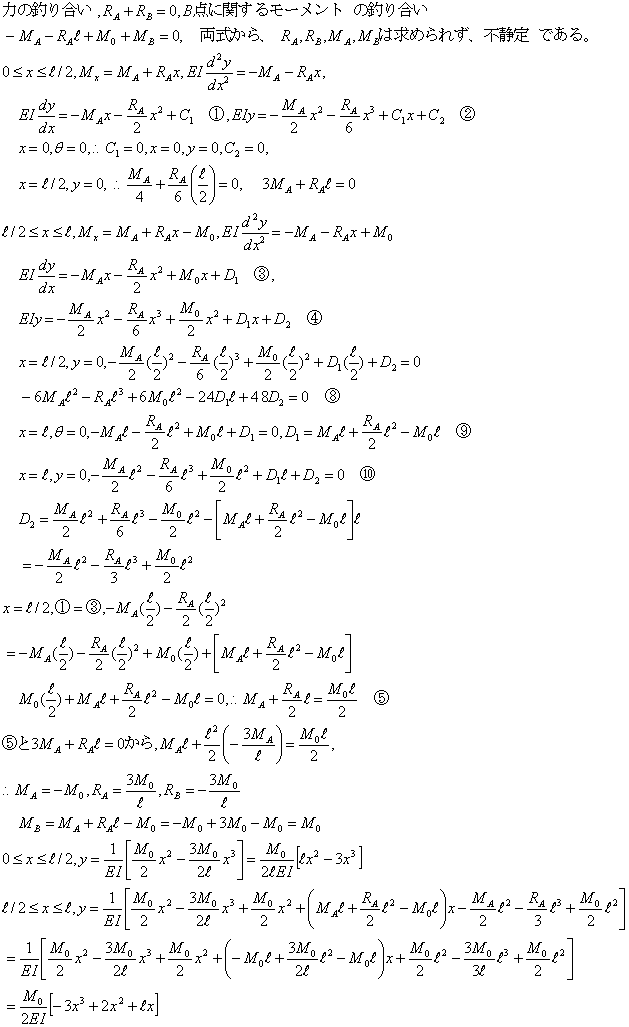図の両端固定梁の中心にMoのモーメントが作用する場合、たわみの式を求める。