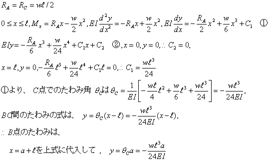 下の図の梁の場合に、AC,BC間のたわみの式とC点のたわみ角とB点のたわみを求める。梁の弾性係数E,断面二次モーメントをIとする。