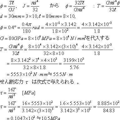 直径30mm、長さ80mmの丸軸がトルクを受け軸端で0.4°のねじれ角を生じた。このとき生ずるねじり応力τと軸に加わったトルクTを求める。軸の材料の横弾性係数は80GPaとする。