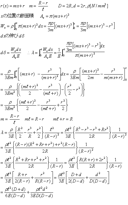 長さLのテ―パ付き丸棒を太いほうを上にしてつるす。直径は小さい方をd、大きい方をDとする。自重による伸びはいくらか。単位体積当たりの重量をw、弾性係数Eとする。直径は直線的に変化するとする。