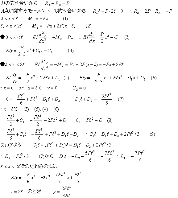 図のようなはりの場合にC点におけるたわみを求める。