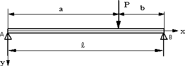 | (2).図2の単純支持はりの場合に、最大曲げモーメントが生ずる位置とその値、生ずる応力を求める。さらに、たわみ曲線と最大たわみを求める。ただし、 P=30kN, L=400cm,a=250cm.b=150cm,E=206GPa |