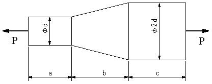 | 【問題104】 | 図のように直径dの長さaの円柱の部分、直径dから2dに変化する長さbの部分、直径2dの長さcの円柱の部分からなる部材に引張荷重Pが作用する場合に、この部材の伸びを求める。ヤング係数をEとする。 |