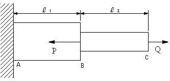 図のように、A点が固定され、段付き部Bに荷重P=100kN、自由端Cに荷重Q=60kNを図の向きに受けるとき、B、C点の変位を求めよ。 |