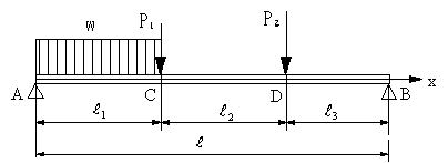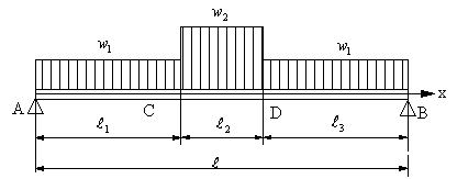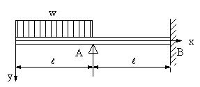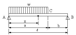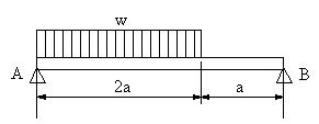| 【問題120】 | 図のように、AC間に単位長さ当たりwの等分布荷重が作用しいるとき、せん断力図、曲げモーメント図、最大曲げモーメントが生ずる位置とその値を求める。a>bとする。 |