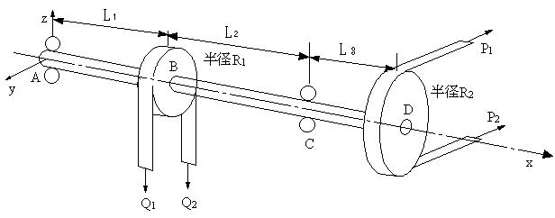 | 【問題113】 | 軸受A,Cで支持されたL1=200mm,L2=300mm,L3=100mmの回転軸に、半径R1=100mmとR2=200mmの2つのプーリーが取り付けられている。プーリーの位置とベルトの張力を図のようにP1=200N,P2=340N、Q1=640N,Q2=360Nとしたとき、材料の許容引張応力110MPa、許容せん断応力50MPaとするとき、安全な軸径dを計算する。AとCは軸受けの位置である。 |