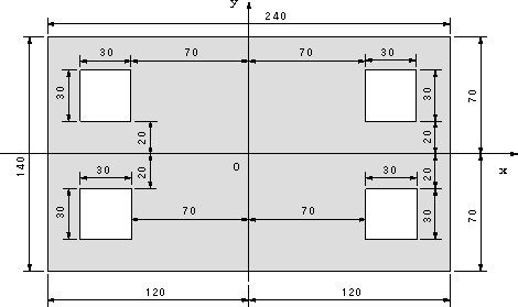 | 【問題118】 | 横240mm、縦140mmの断面に、図のように、30mm×30mmの正方形の穴が4つ空いている。この断面のx軸に関する断面二次モーメントを計算する。 | ||||