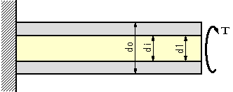 | 【問題123】 | 直径d1、横弾性係数はG1の丸棒に外径do、内径di、弾性係数はG2の円筒を接合した複合材料の軸がある。この複合材料の軸ABの一端Aを剛性壁に固定し、他端Bにトルク(ねじりモーメント)Tを加えるとき。円筒に作用するトルクT2および丸棒に作用するトルクT1を求めよ。ただし、 d1=diとする。 |