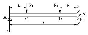 | 【問題145】 | 図の両端支持はりの場合に、せん断力Vx、曲げモーメントMxを求め、せん断力図、曲げモーメント図を描く。 ただし、a=1m,P1=10kN,P2=7kNとする。 |