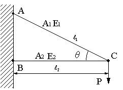 | 【問題144】 | 図のように、ACとBCをC点でピン結合し、他端も固定壁にピン結合されている。C点に荷重Pが下向きに作用するとき、C点の変位を求める。 ただし、ACの長さ、ヤング係数、断面積をl1,E1,A1とし、BCの長さ、ヤング係数、断面積をl2,E2,A2とする。 |