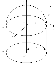 | 【問題134】 | 密度1.3g/cm3、半径a=18cm、高さh=24cmのエポキシ製円柱に、密度2.7g/cm3、半径a=18cmのアルミ製半球を図のように接着した。この連結体の重心(xG,yG,zG)を求めよ。ただしz軸を円柱の軸に一致させ、x,y面を接着面上にとるものとする。 |