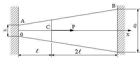 | 【問題137】 | 厚さt、 一方の幅b、他方の幅4b、長さ3Lの板が、図のように両端を剛体板で固定されている。C点に荷重Pが作用するとき、A点の反力Ra、B点の反力Rbを求める。弾性係数をEとする。 |