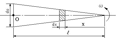 | 【問題142】 | 底面の直径がd0の円錐状の弾性棒(長さL,ヤング率E,密度p)を、角速度ωで回転させる。棒の先端の変位を求めよ。 |