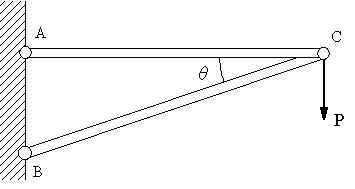 | 【問題133】 | 図のように、A、B、Cでピン結合され、BCは剛体壁に対して直角、∠ACB=θである。P点に荷重Pが鉛直方向に作用している。棒AC、BCの長さ、断面積、弾性係数をそれぞれ、L1,L2,A1,A2,E1E2とするとき (1).AC、BCに生ずる応力σ1、σ2を求める。 (2).AC、BCの伸びΔL1、ΔL2を求める。 (3).C点の水平方向、鉛直方向の変位量を求める。 |