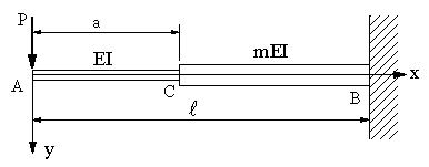| 【問題151】 | 図のような片持ちばりで、先端からaまでは、曲げ剛性がEI,aからLまでがmEIのとき、自由端におけるたわみと、たわみ角、たわみの式を求める。を求める。 |