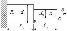 | 【問題152】 | Aで固定され、直径とヤング率と長さが異なる棒を図のように組み合わせた棒のC面に荷重を加え、δだけ変位させた。このときの各棒に生じる各部の応力とひずみを求める。ただし、各部材の弾性係数をE1,E2とする。 |