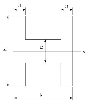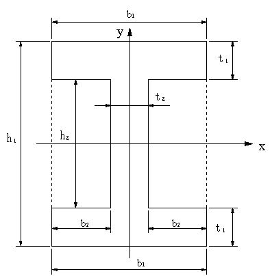 | 【問題153】 | 図において、長さ5mのI形鋼を単純支持ばりとして用いたとき、はりに働いている重力によるたわみを求める。ただし、鋼材の単位当たりの質量を7.85×10-6kg/mm3、縦弾性係数を206GPaとする。b1=75mm,t1=8mm,t2=5mm, h1=100mm, h2=84mm |