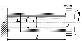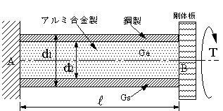 | 【問題182】 | 図のように、長さL=0.8m,外径d1=60mm,内径d2=50mmの鋼製のパイプと直径d2のアルミ合金の丸棒で製作された複合軸がある。鋼管、アルミ丸棒の許容せん断応力はそれぞれτs=140MPa,τa=70MPaで、せん断弾性係数はGs=80Gpa,Ga=28GPaとする。負荷できる最大トルクTmaxを求めよ。 |