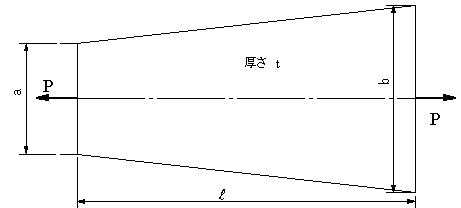 | 【問題164】 | 図に示す厚さtの台形板に引張荷重Pが作用した場合に生ずる伸びを求める。ただし、ヤング係数をEとする。 |