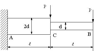 | 【問題165】 | 図の直径dの片持ちばりの場合に、 (1).最大曲げモーメントと生ずる最大応力を求める。 (2).たわみ曲線を求める。断面二次モーメントI、ヤング率Eと置く。 (3).C点におけるたわみ角とたわみを求める。 (4).最大たわみを求める。 |
