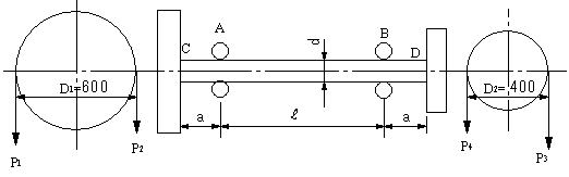 | 【問題174】 | 図のように、両端に直径600o及び400oのプーリーを有する直径40oの軸がA、Bでベアリングで支持され、プーリーには、P1,P2,P3,P4の力が作用している。軸に生じる最大曲げ応力と最大剪断応力とを求める。ただし、P1=2[kN],P2=1[kN], P3=1.5[kN],P4=1[kN]である。 |
