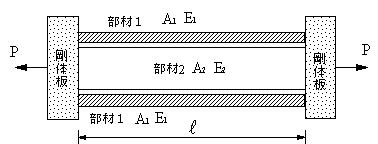 | 【問題196】 | 図のように、断面積A1の円筒の中に、断面積A2の中実丸棒を温度T1で剛体板で接合した。その後、温度T2(T2>T1)を変化させたときに、熱応力によって両材に生ずる応力、σ1とσ2を求める。T1の時の初期長さlo、線膨張係数 α1,α2(α1<α2),ヤング率 E11、E2とする。 |