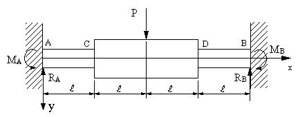 | 【問題190】 | 図の不静定梁の場合にもせん断力、曲げモーメントを求め、せん断力図、曲げモーメント図を描く。最大な曲げ応力とせん断応力を求め、また、たわみ角、たわみ曲線を求める。 |