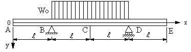 | 【問題183】 | 図のような等分布荷重がBD間に作用する梁の場合に、AD間のたわみの式とA点、C点におけるたわみを求める。なお、弾性係数E、断面二次モーメントIとする。 |