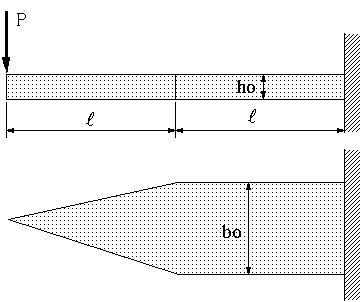 | 【問題189】 | 図のように、厚さhoが一様で,幅が異なる片持ちばりの場合に自由端のたわみを求める。 |