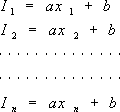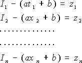 | 式(10)を観測方程式という。 式(10)は未知数はa, b2つで、方程式はn個であるので満足するa, bは存在しない。変位xIにも実際は誤差がはいるが、ここでは誤差がないものとして、電流I1, I2, ----, In の 誤差を、それぞれ、z1, z2, ----, zn とすると |