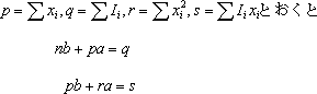 | を最小になるように決定するのが最小二乗法の考え方である。Sが最小の時、Sをaとbで微分した値が0であるので次式が成り立つ |