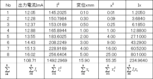 | 前掲の出力電流Iと変位xのデータの関係が I = ax + b (9) の一次式で表されるとし、n個の変位、x1,x2, ----, xn に対して電流Iの測定値が、I1, I2, ----, In であったときに、最適な定数、a, b を決定するために最小二乗法を適用する。 式(9)にそれぞれのデータを代入する。 |