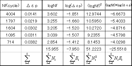 logC=b であるから C = 100.298 =1.986 となり、関係式は △εp・Nf0.5917= 1.986 となる。 |